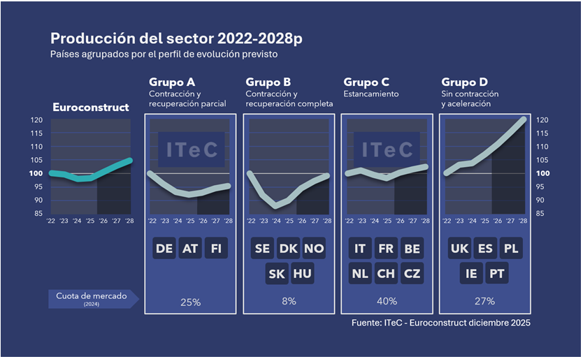 El análisis por países aporta datos esperanzadores. Mientras que en el pasado informe Euroconstruct de junio de 2025 Alemania, Francia e Italia estaban entre los países con más dificultades para recuperarse de la recesión de 2023-24 en materia de construcción, en el informe actual el único gran mercado que continuará en esta situación es Alemania. Por su parte, España, Reino Unido y Polonia siguen en la parte superior del ranking, con posibilidades de sacar más partido de la fase expansiva de los próximos años, ya que anteriormente se han visto menos afectados por las turbulencias sufridas en el resto de los países.