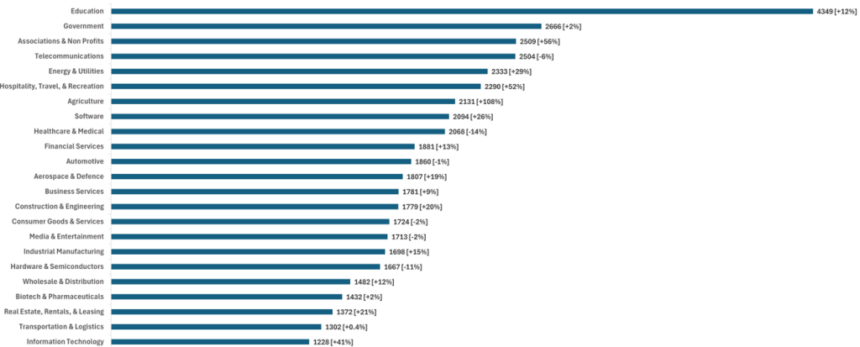 A continuación, se encuentran las Instituciones Gubernamentales, que registraron 2.666 ciberataques semanales por empresa, mientras que las asociaciones y organizaciones sin ánimo de lucro registraron el segundo mayor crecimiento entre todas las industrias, con 2.509 ataques semanales, lo que representa un aumento interanual del 56%. Los recursos limitados de ciberseguridad y la creciente dependencia digital siguen elevando el riesgo para estos sectores.
